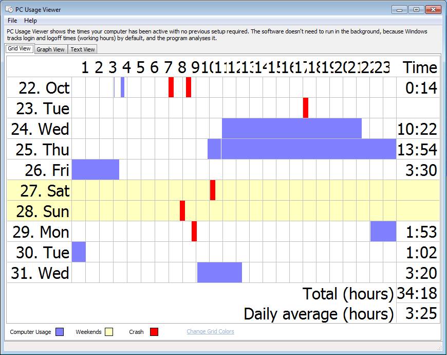 What you see in the image above is the default window of PC Usage Viewer, but what you’ll see will obviously look a bit different, depending on your PC activity. The purple area signifies the time Windows has been working, the yellowish are weekends, while the red stands for system crashes. The colors can be changed, and in the grid view, which is the one that can be seen above, where on the left we have days and on top hours. There are two more ways of how you view the usage logs of your Windows system, via graphs or text view.