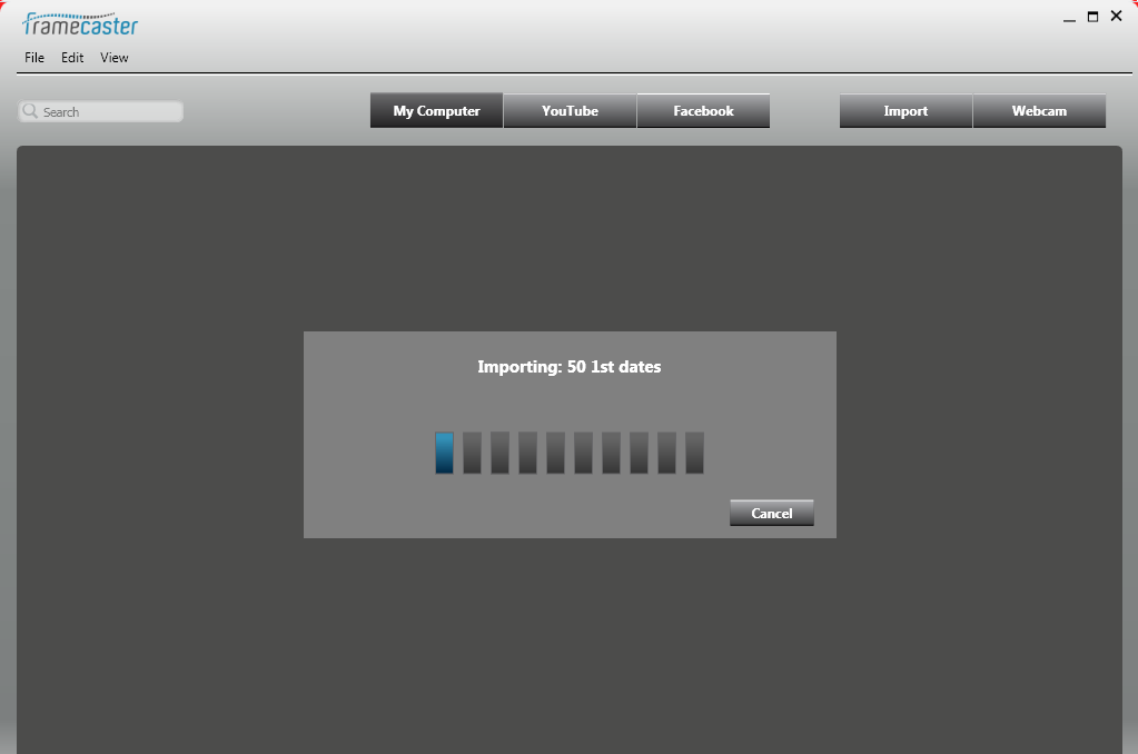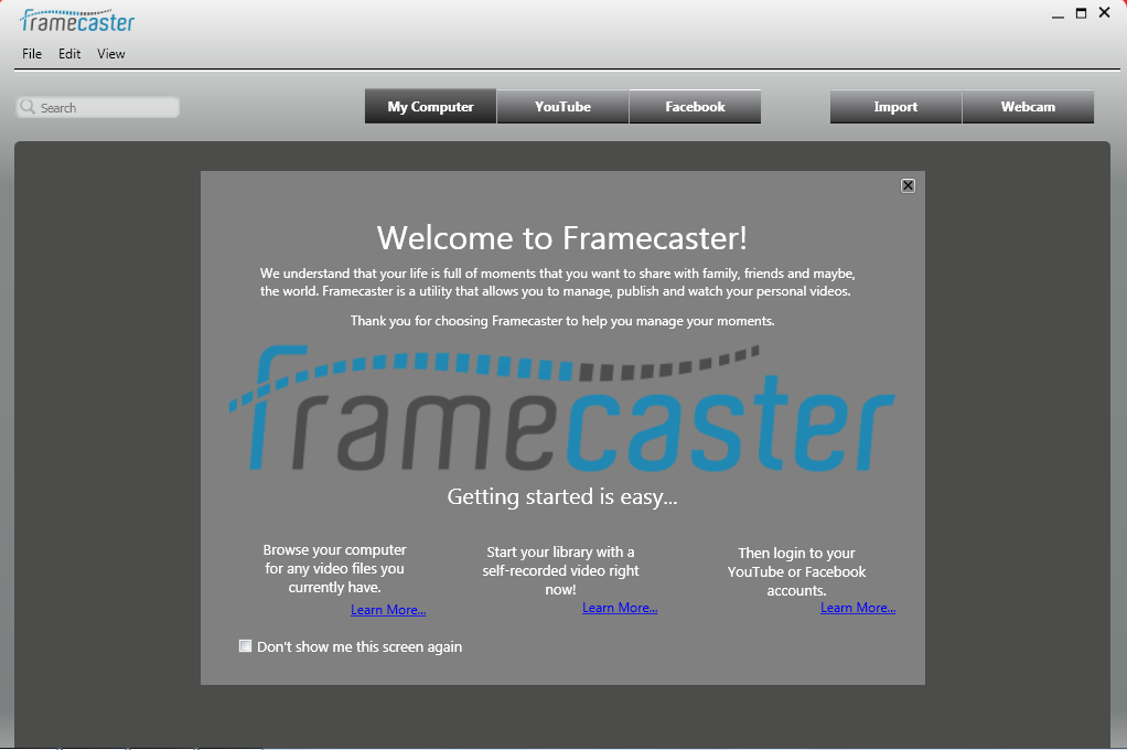 The initial window that appears on launching the software is very attractive with a greyish tone to it. At the top you would observe the tabs to MyComputer, YouTube, Facebook, Import, and WebCam. You can access the corresponding folders and sites through each of these tabs and then manage as well as share your videos easily.