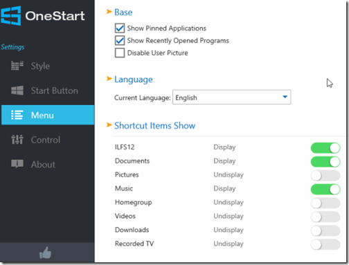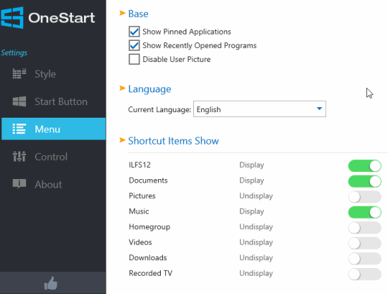 Menu: This option lets you show/hide pinned applications in the Start Menu, change language and the programs that you want to display or hide on start menu. You can also enable or disable user picture from this option.