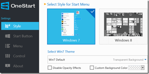 Style: This option lets you choose Windows 7 or Windows 8 as your Start Menu style. For Windows 7 style, you can select Windows 7 themes and choose any solid color as a theme. For Windows 8 Start Menu, you can select the size of the icon.