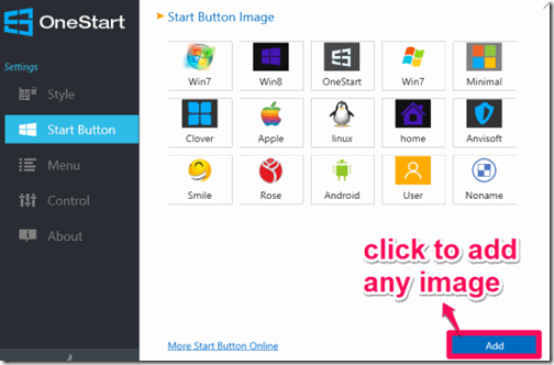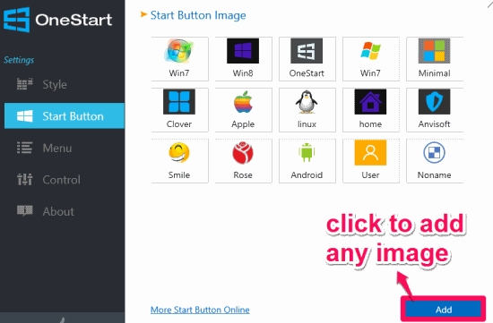 The app provides many different options to customize your Start Menu: Style, Start Button, Menu, and Control. You can choose icon for start menu from provided 15 different options as per your choice. You can also add a custom image as icon.