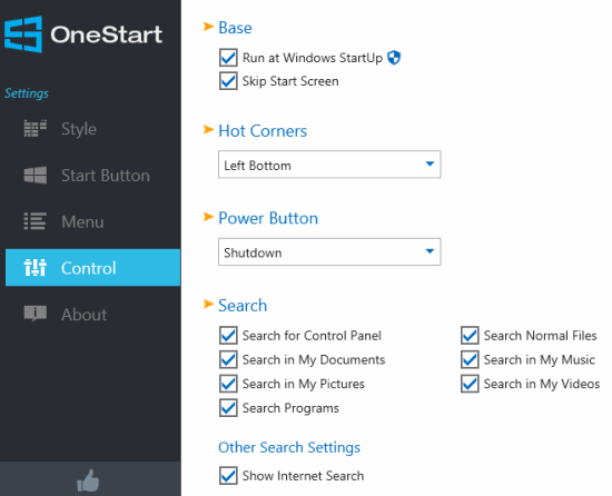 Control: This option lets you set startup, hot corner, power button and search options. Hot Corners feature of Windows 8 lets you switch your desktop to the Metro start screen and easily access your programs.