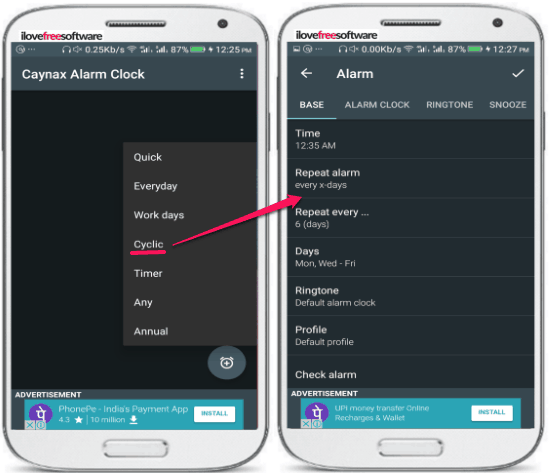 In this article, you will find 3 Android apps to set recurring alarms. In simple words, you can set an alarm for a day and time and make it repeat after “X” number of minutes, days, or specific days of a month, etc. These apps can remind you to take pills on time, going for jogging every morning or any alternate day, etc. What excites me more is that you can set ringtones from your phone as alarm tone and these apps can even blow the horns for you even if your phone is in silent mode.