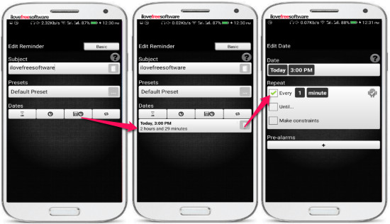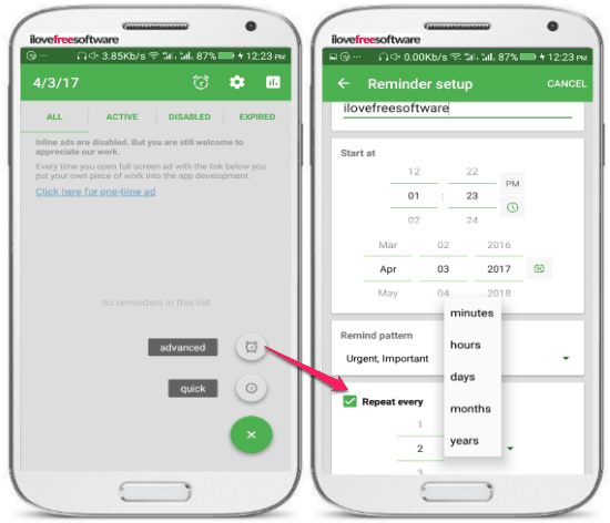 After installing this app, tap on the “+” button at the bottom-right part of the screen and then select “advanced” option. Now, you can set a self-repeating alarm; just specify the date and time and then enable its “Repeat every” option. This allows you to set a time interval after which the alarm will be played again and you will hear a ringtone as specified by you in the settings. As I mentioned, you can set the alarms in reMind to be repeated after every “X” minutes, hours, days, etc. If you just want to repeat it for some specific days in a week or month then there is an option for that too. At last, tap on the Done button and your alarm will be activated.