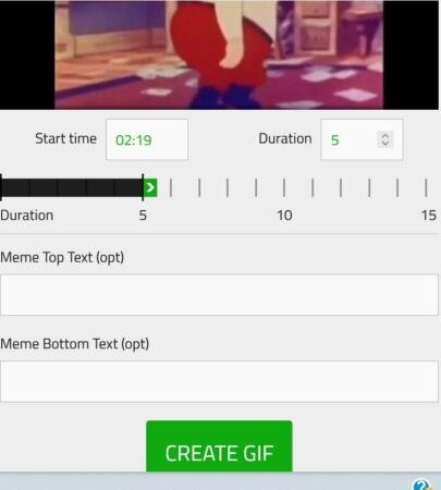 On this page you can enter a start time from the video, from where you want your GIF to start. Then define how many seconds you need in the GIF. You can choose 5, 10, or 15 seconds. Then if you want you can enter text for your GIF as well in the fields given below. Then click the create GIF button to start the process of creating your GIF. That is all you need to do to create a GIF. Once the GIF is created you can share it on Facebook or Twitter.