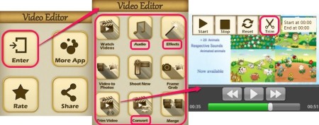 Video Editor All in One is a Android video editor that lets you shoot videos, edit them, add effects to videos, and do much more. It also allows you to merge two video clips that are in AVI format. You can even trim videos to a start frame and last frame.