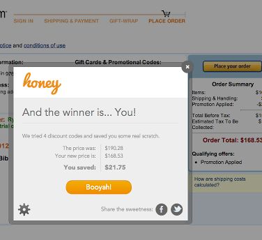 To get the coupons, the only thing that you need to do is start shopping, assuming that you installed the extension. When you get to the checkout on one of the supported online stores, you’ll see a “Find Savings” button there. After clicking on that button, Honey will search for and automatically apply coupons. You will receive a report similar to the one above, that tells you how much money you’ve saved.