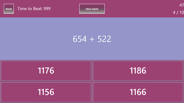 Mental Maths quiz is a free app that tests your mental Math skills by testing you out on 10 difficult questions that you have to answer in the shortest possible time. The timer will appear at the top-right corner of the screen, and you will be able to choose the correct answer from the choice of four options displayed at the bottom of the screen by clicking on the correct answer. The correctly answered questions will be displayed in the top right corner just below the timer, for instance in the above screenshot, I have correctly answered 4 questions out of 10. Your high score in seconds will appear at the top left corner of the screen and the goal of the quiz is to beat your high score by answering all the questions as fast as possible!