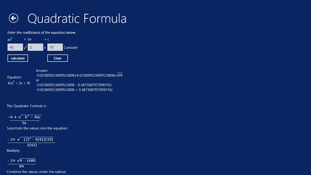 Math Solver is a free app for Windows 8 devices that allows you to calculate complex quadratic equations, fractions, geometry, etc. When you launch the app, you will be presented with an interface where you can choose any of the above mentioned options. Upon choosing the above options, you will be taken to the next step where, for instance, if you have chosen the Quadratic equations, you will be asked to enter the coefficients of the equation so that the app can solve the equation for you. Once that’s done, you can click on the calculate button to get your results. One great feature of this app is that it allows you to multitask, as it supports snapped view!