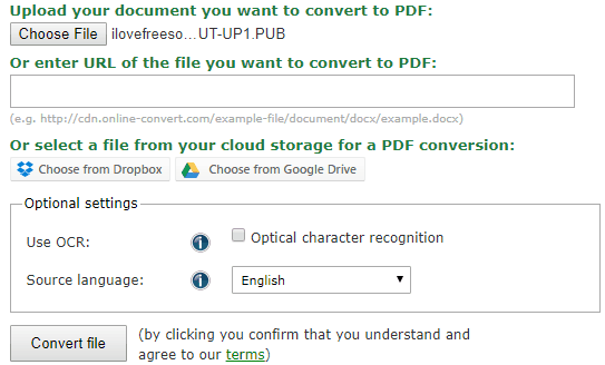 OnlineConvert.com is an all in one file converter that can convert eBooks, images, documents, audio video, etc. Among all these file conversions, PUB to PDF conversion is also supported. This website lets you upload a PUB file from PC, online PUB file URL, Dropbox, and Google Drive. So you have different options to upload PUB file. Once the PUB file is added, use Convert file button. This will upload the file and begin the conversion.