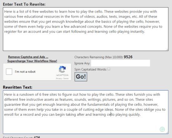 Spinbot is the final website in the list to rephrase sentences. You have to enter the text and enter the captcha code. Do remember that you can rephrase only those texts which have number of characters equal or less than 10,000. On entering the text, Spinbot shows you the name of characters in the entered text. You can also choose whether you want to rephrase the words with capital initialization or not. Click on Go and website will show you rephrased text. The website shows number of characters even for output text.
