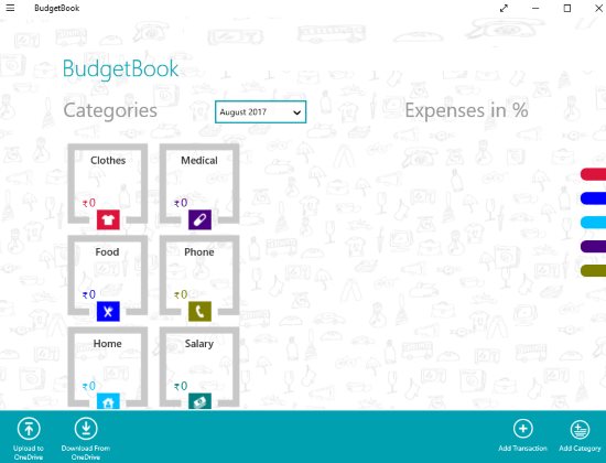 BudgetBook is a free personal budget maker app and its interface can be seen in the screenshot above. Here you have all the categories under which you can add your expenses. Under salary you can add all your income. You can also add more categories to the already existing list, by clicking the add category button on the bottom right corner. Just add all your income and expenses on a daily basis to keep the budget maker up to date. When you start entering data it will be shown on a pie chart which is visually appealing. Also the data will be plotted on a graph showing you the comparison between income vs expenses. You also get the option to backup your data to OneDrive.