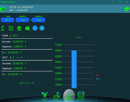 Budget Assistant is a free personal budget maker app for Windows 10. In this app you start of with a blank screen with just the option to add income and expenses given at the bottom. You can start with adding you total income. Then you can add expenses under various preset categories. In case you want to add more categories to the app you can do that as well. Just go to the category option given at the bottom of the page and there you will be directed to the categories page. On this page you can add more categories which you need. The reports option at the bottom will generate various reports for you like monthly or yearly report, just expenses details, graphical representation of the data, etc. You also get the option to print the report that you have generated along with the option to export the data in csv format. The settings option in the app will let you change the language of the app and change the currency being used. You can also choose the option to show info on live tile.