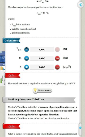 As you read through a lesson, at the end of it there’s going to be an option for launching a quiz. Quiz is either a question, or an assignment to solve an equation related to the previously explained material. Mechanics, electromagnetism and thermodynamics are covered by this physics learning app.