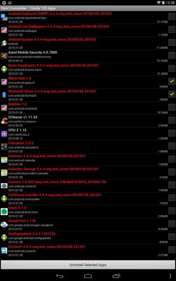 System apps are going to be in red, to help you differentiate between them. Use caution when deleting apps so you avoid deleting important apps. Multiple apps can be selected and deleted at once, one after another.