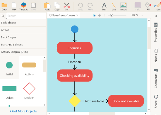 Cacoo is another free website to draw activity diagram online. The best part of using Cacoo is that you can collaboratively create activity diagrams and chat at the same time. In its free version, it allows you to share an Activity diagram or other modeling diagrams with up to 15 people. So, if you have a small sized team of up to 15 members then Cacoo can be the perfect platform to team up and draw software design and architecture diagrams. You can also draw Class, Object, Sequence, State Chart diagram, etc. In addition to that, you can create an unlimited number of projects and each project can contain up to 6 sheets. But, you can only export an activity diagram in PNG format.