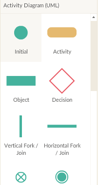 Editing interface of Draw.io consists of a toolbar on the left side and the editing canvas on the right. The editing toolbar includes most of the drawing elements required to draw the activity diagram. You can find these drawing elements in the UML category of the toolbar, as shown in the screenshot below.