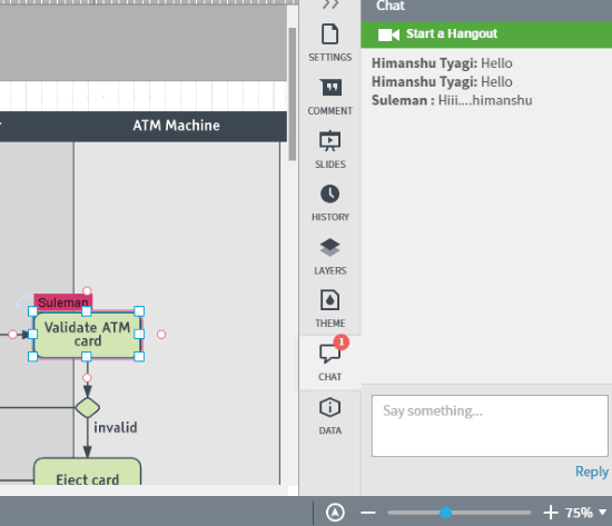 As I mentioned, you can also chat with the collaborator. You can do this via Chat floating widget. Again, if it’s not visible on the Cacoo interface, then you can toggle it from the View>>Chat option. This will enable the chat widget and you can then chat will all the online collaborators, as shown in the screenshot below.