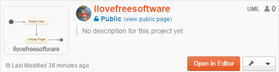 The editing interface of GenMyModel makes the drawing of activity diagrams a very easy task. You just have to select an element from the toolbar and then click anywhere on the editing canvas to edit it. Various elements in the toolbar include Action, Initial Mode, Activity Final, Decision, Control flow, etc. You can also copy and paste diagram elements within the editing interface. In addition to that, there is also an option to undo changes by Control+Z hotkey. As I mentioned above, the free plan of GenMyModel allows you to create public projects with limited size. This limited size is indicated at the top-left part of its interface as a progress bar. I read on its official blog that once this bar is full, you won’t be able to add more elements and you can just modify the existing elements on the editing canvas but I was able to add more elements and save the project. I checked that by visiting the public page of my project where I saw the newly added elements. You can also download your project as JPG, SVG, and PNG image from the public page. The link to the public page of a project is provided in the Project Dashboard, as shown in the screenshot above. You can also add other types of UML diagrams in a project like Class, Object, Use case, Sequence, State, and Activity diagram.