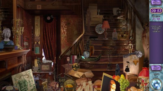 As the name starts with paranormal, there has to ghosts in the game. Yes there are and you have to get stuff back which has been stolen by the ghosts. Spooky. The game starts with a conversation between the detective and the orphanage caretaker. Then you see a room scattered with objects like you can see in the screenshot above. Now a list of items can be seen on the right side of the screen. You have to find all the listed items from the scene presented to you. Some of the objects are very well blended and you can’t make them out easily. So there is a hints button which will light up the area where an item can be found. But you get only 4 free hints, so use them wisely.