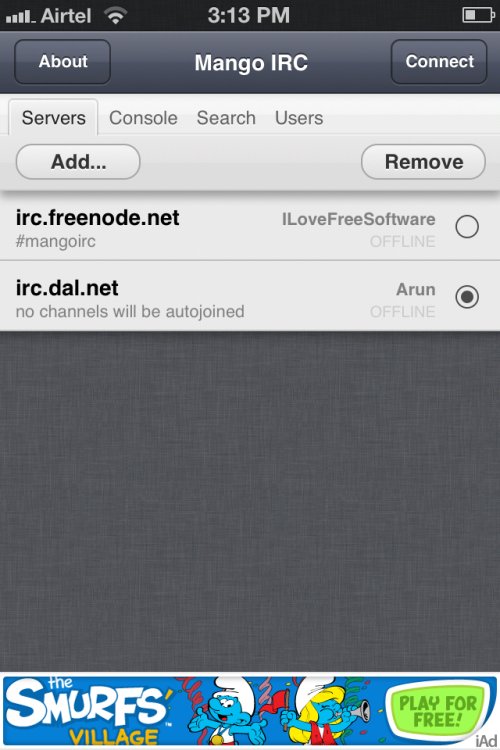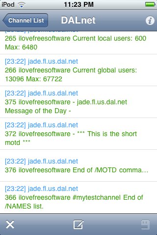Mango lite is another free IRC iPhone client. This IRC client has a huge set of impressive features. The application supports multiple server, SSL, multiple channels, One-to-one chats etc., like any of the IRC clients for iPhone. It is easy to maintain multiple conversations with its Tab navigation feature. Apart from the standard features the application offers some special ones:Visual user WHOIS command, small keyboard for efficient use of screen real state,URL hilighting, full-screen that hides the status bar, ability to log chat, transfer it to the computer via iTunes. This IRC client for iPhone is really feature rich and I would highly recommend this app for anyone.