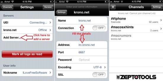 IRChon is one of the most popular free IRC clients for iOS devices. To add a server just go to settings, fill up the details and save it. Go back to setting and toggle connection to ON and you will be connected. Once you connect to a server, it will show you various channels, alongwith number of users under each channel.