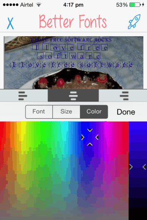 - If you want to place this text on a photo, then click the camera icon. This will let you pick a photo from your camera roll or click a new picture. Now your text will appear on this picture. You can adjust the size of the text, the color of the text, and also change the font of the text. You can also move the text around on the photo and change its location. Once done, click on the rocket icon at the top right corner. This will save the picture to your photo library. From there you can share the photo as you usually do. Below is a screenshot of the text being placed over a photo and editing options available with it.