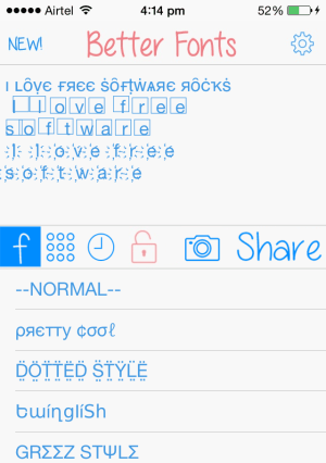 If you are bored with using the regular font on any of the above mentioned apps and want to try something fun, than this is the app for you. Below you can see the interface of this app when you first launch it. Well I have already tried a few fonts in the below screenshot, that part of the app would be empty otherwise when you start.
