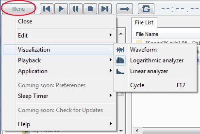 - You can close this player, delete selected file, select the desired waveform visualization, sleep timer (to hibernate, log off etc. your system) etc. using this Menu button.