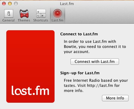 The application is not just limited to simple controls, Bowtie can also connect with Last.fm and it scrobbles the songs that you listen to in iTunes. To activate this just open the preference and sign up with your last.fm credentials. Anyway there is an option that is checked on from the begining by default that allows Bowtie to automatically download the missing artwork from last.fm.