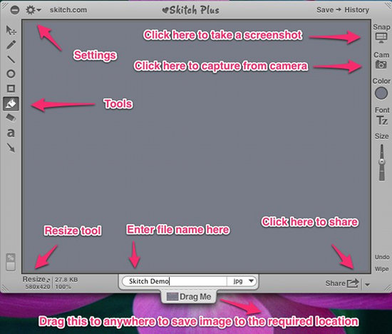 This free screen capture software for Mac has been quiet popular from the day it came out, recently this application has been acquired by Evernote, this just proves the popularity of this software. This application is also available for other platforms like Android and iOS devices. This free screenshot tool for Mac makes it amazingly easy to draw shapes, points, lines, and add watermark to an image. Here in the screen shot below, you can see a silly example I have created using Skitch for Mac.