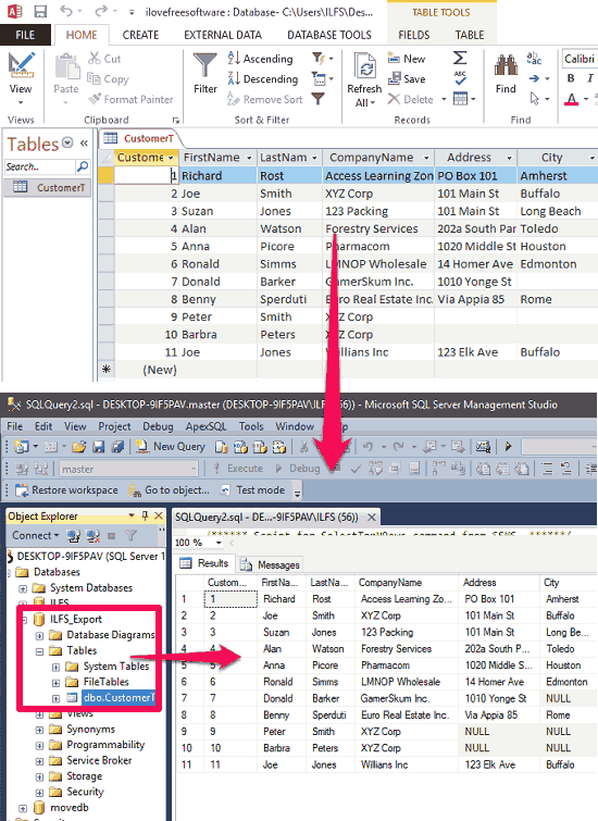 Access To MSSQL is a free software to convert MS Access to SQL Server. You can easily convert an ACCDB and MDB database to SQL Server compliant database. It lets you specify an Access database file from any location on your PC and then you can select tables from it to convert to SQL Server. Also, you can opt to directly transfer the database to SQL Server or export it as a SQL dump file. This software allows you to specify some table conversion options like transferring index, Unicode encoding, transferring records, create new tables, etc.