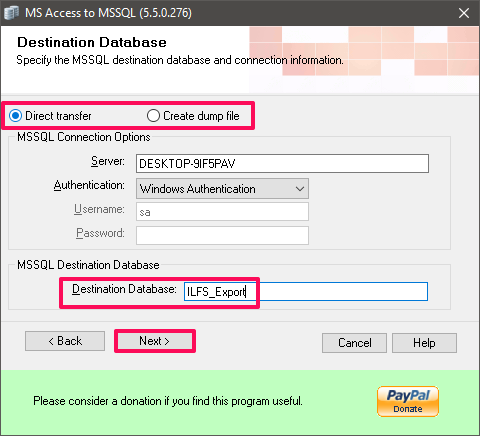 Step 2: It will ask you to specify the database destination. You can opt to either transfer the database directly to SQL Server or you can opt to export data to a SQL file. Based on what you want, you can choose the export option. In my case, I will use the Direct transfer option.