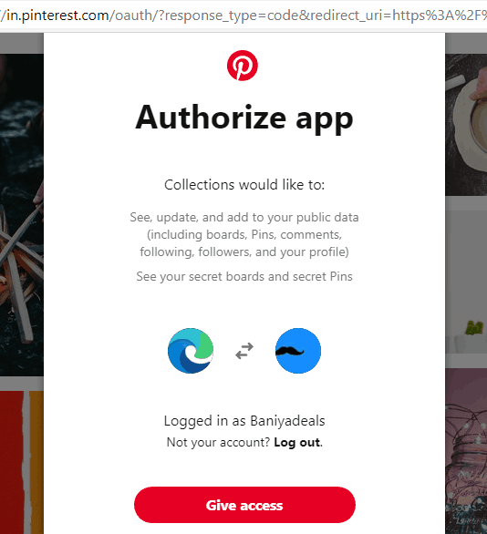 In the beginning, you will have to authorize Edge to access your Pinterest account. After that, it will directly take you to the board creation page where you can organize your content. After making the board, you can simply publish it there. This is as simple as that.