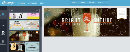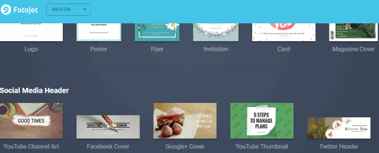 FotoJet is another free online Twitter cover photo maker which works in the same way as other two Twitter cover makers on my list. It also provides tons of templates to choose from, which can be customized and then downloaded as an image. Not all templates are free to use but most of them are. You can use it for three purposes: designing a social media post for YouTube channel art, Facebook, Google+, Tumblr, etc., edit a photo, and make a collage.
