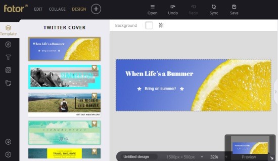 Fotor is another free online Twitter cover photo maker on my list. It also lets you create designs for other social platforms like Facebook, Instagram, Pinterest, Google Plus, etc. You can work with it in the same way as you did in Canva i.e. select a template and then personalize it. Apart from that, you can add images, stickers, text, and shapes to your Twitter cover photo. Do note that not all templates are free to use, try to stay away from the templates marked with a diamond.