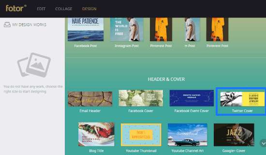 Start by creating a free account on Fotor. After that, select the “DESIGN” option which will open its online editing interface, as shown in the screenshot above. It will automatically pop-up a screen and will prompt you to select a design type. Select “Twitter Cover”, as shown in the screenshot below.