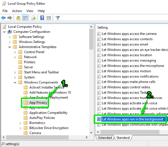 Step 2: Jump to App Privacy folder in that window. The path for that folder is here:Computer Configuration → then double-click on Administrative Templates → do the same for Windows Components folder → and App Privacy folder will be there. Select that folder and on the right-hand side, double-click the “Let Windows apps run in the background” option.