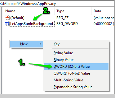 Step 3: Create a DWORD value under the AppPrivacy key on the right-hand side and name it “LetAppsRunInBackground“. The screenshot below will help you in that.