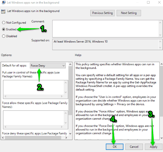 To enable the option to let apps run in the background again, just repeat the steps added above, and set the Not Configured in step number 3.