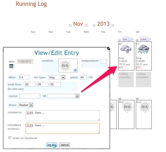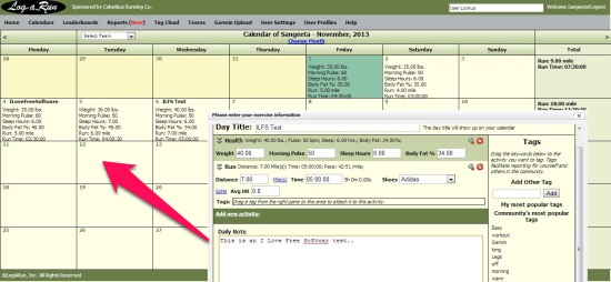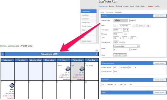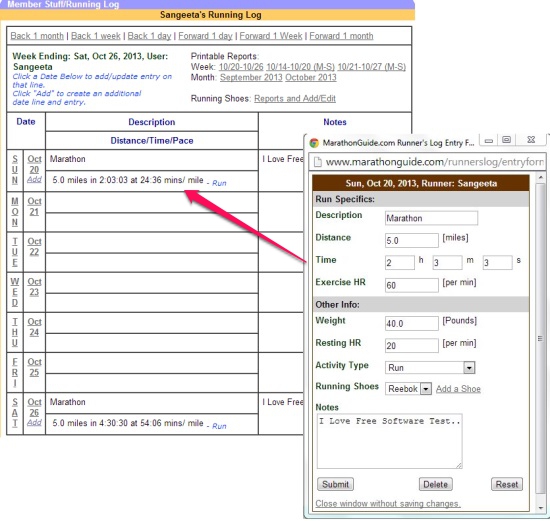 Next is Log A Run, a free online site to store details of your running logs and wellness information. The service lets you  easily track your miles, shoe mileage, weight, body fat, etc., for running, aerobics, and other physical activities (swimming, biking, ). The information gets displayed in a calender form, where you can endlessly enter details and create a log. Plus, you can make notes, create custom reports and charts, and even backup your logs. The service also allows creating teams and managing them with a lead coach.