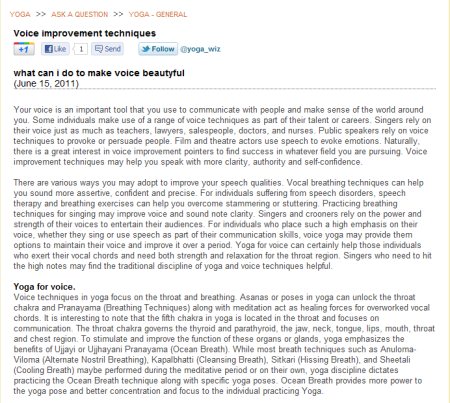 Yoga Wiz is an excellent website that provides Yoga asans to help you improve voice and to make voice beautiful and attractive. There given is a short and quick post from where you can learn Yoga asans for improving the quality of your voice.