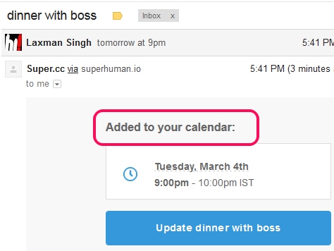 It is quite handy if you are working on Microsoft Outlook or any other email desktop client app, and also with those apps which do not provide option to access your Google Calendar to add events. In those cases, you can link your account with super.cc (one time task) and can easily add events to Google Calendar with any app (that lets you compose emails). It also provides email notifications to your associated Gmail account so that you can update the event, if needed.
