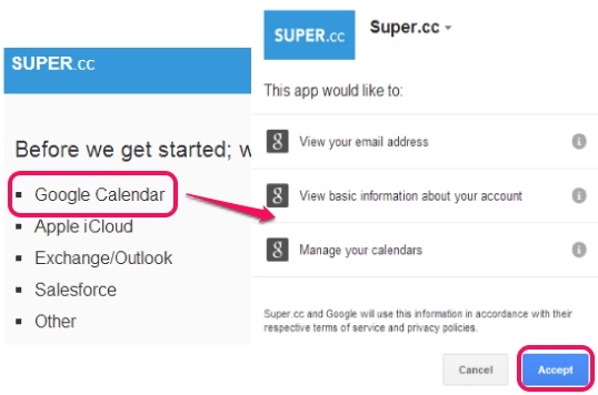 Note: This service is in its starting period. At present, Super.cc is helpful to connect Google Calendar. But in future, it would be able to add events for Apple iCloud, Exchange/Outlook, Salesforge, and other calendars.