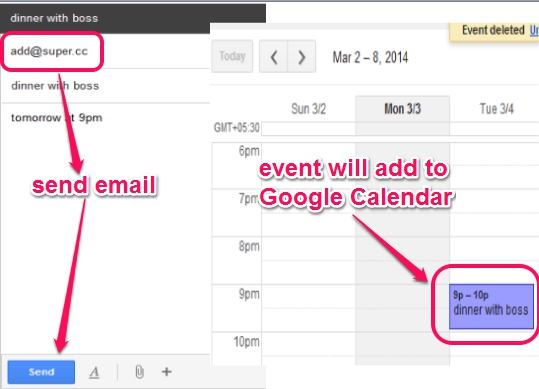 Super.cc is a useful service that helps to quickly add events to Google Calendar by just sending an email. You just need to send an email to ‘[email protected]’ including subject, event details, and rest of the work will be done by this service.