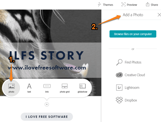 - Photo: You have the choice to use multiple sources to insert a photo to your story. You can add a photo from your PC, Dropbox account, Creative Cloud, Lightroom, or search Creative Common Licensed photos to insert in your story
