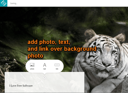 - Glideshow: This option is used to first insert multiple photos (as background) vertically and then insert photo, text, and link over those photos. See the screenshot below. You can also change the position of text box