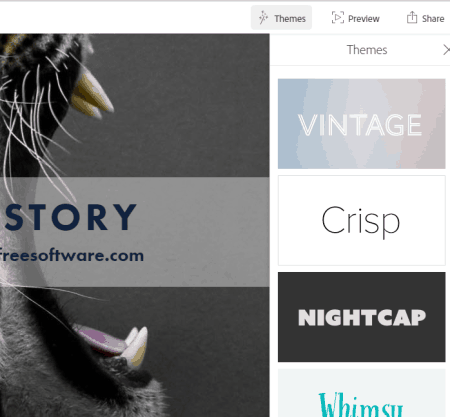 You can also change the default theme for your story. Clicking on Themes option opens a right sidebar that contains different themes. You can click on any theme to change the default them. Interesting part is that text font is changed automatically according to the selected theme.