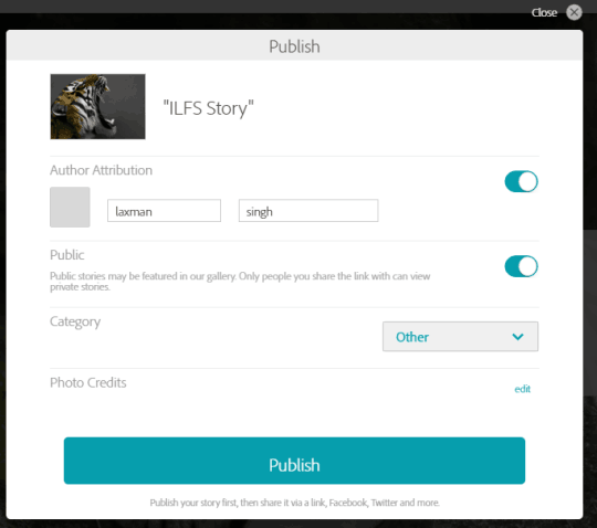 Finally, you can use Share option to publish your story. Before publishing the story, you can make it public or private, enable author attribution, and select a category.