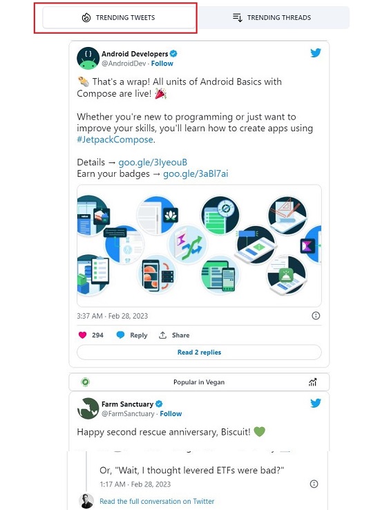 8. To view the Trending Tweets or Trending Threads, scroll down the main page and click on the appropriate tab as required. Like the Community pages, clicking on any Post / Tweet takes you directly to Twitter and navigates you to the selected Tweet.